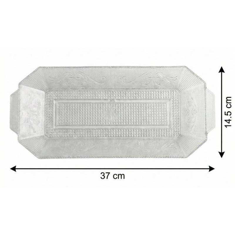 Con unas dimensiones de 37 x 14,5 cm, esta bandeja rectangular presenta un formato alargado muy versátil, perfecto para servir tartas, dulces, aperitivos, carnes, pescados o alimentos salados. Su tamaño facilita una disposición equilibrada de los productos, permitiendo crear presentaciones cuidadas tanto en eventos formales como en celebraciones privadas o reuniones en casa. El material rígido ayuda a mantener la estabilidad durante el servicio.