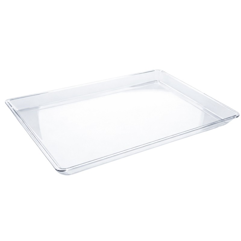 La bandeja rectangular Lux transparente de 37 x 27 cm, fabricada en poliestireno alimentario PS, es ideal para presentar tartas, dulces, carnes, pescados y alimentos salados, aportando resistencia, elegancia y una excelente visibilidad.