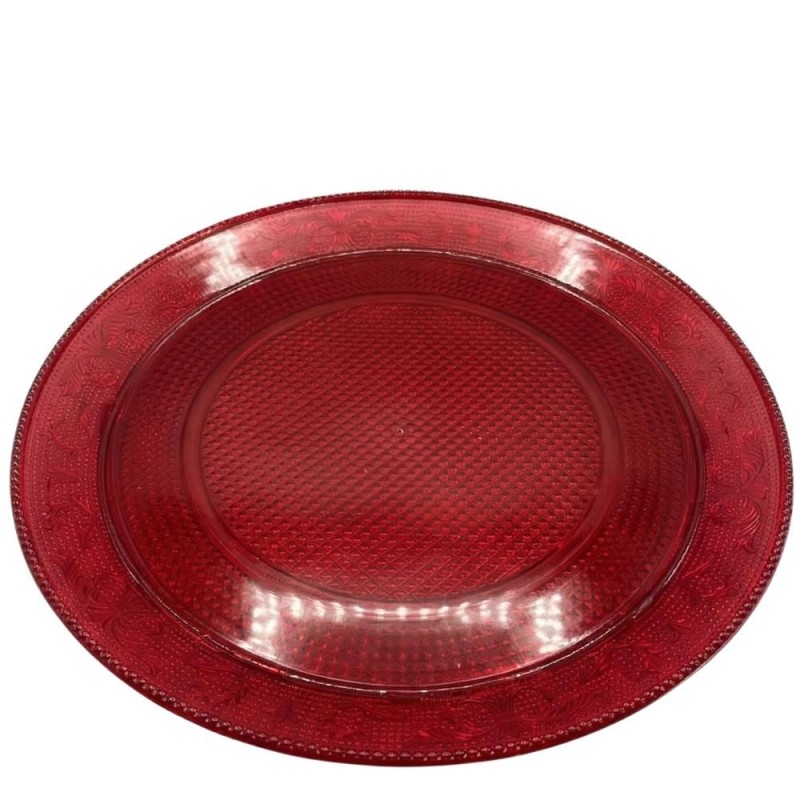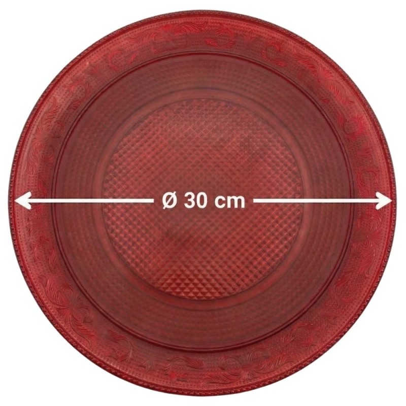 La bandeja Lux redonda rojo translúcido de 30 cm, fabricada en poliestireno alimentario, es reutilizable y perfecta para presentar tartas, dulces, alimentos salados, carnes o pescados con elegancia.