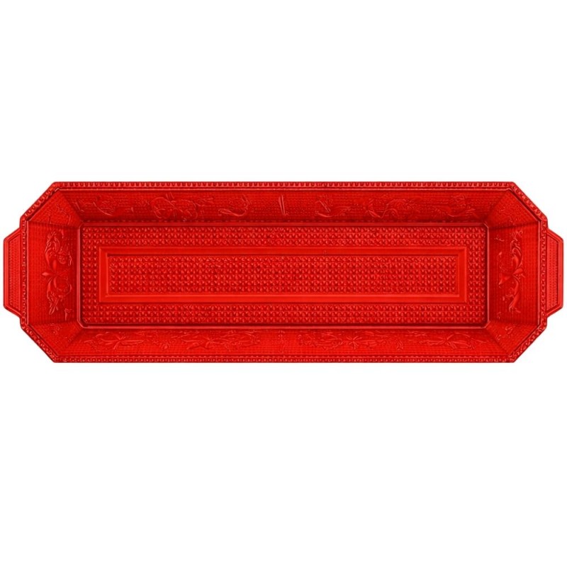 Bandeja rectangular Lux de plástico rojo translúcido de 46 x 14,5 cm, fabricada en poliestireno alimentario y reutilizable, ideal para servir y presentar tartas, dulces, aperitivos, carnes o pescados con estilo.