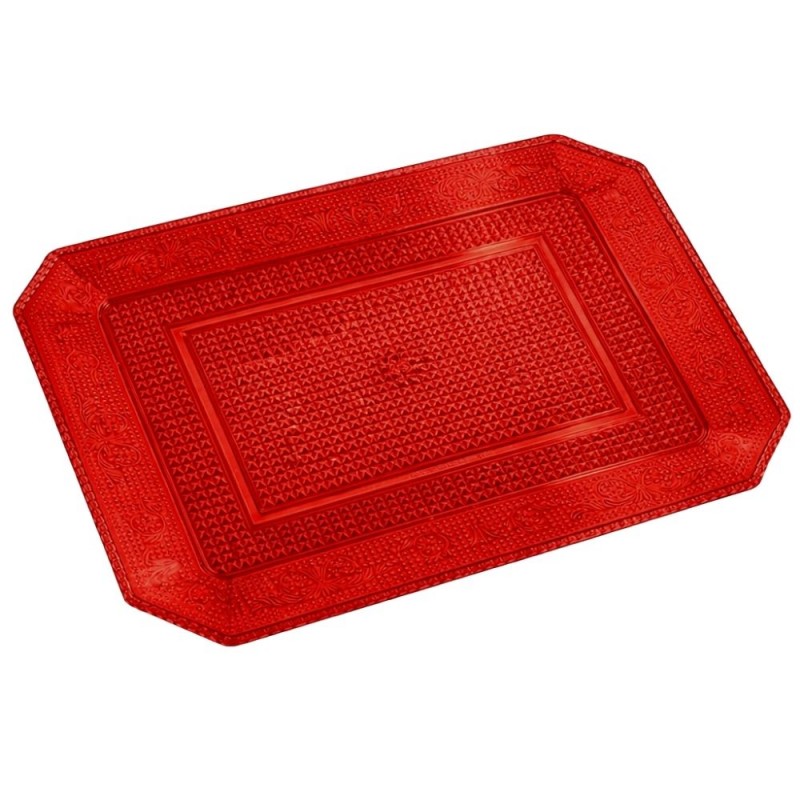 Bandeja rectangular Lux de plástico rojo translúcido de 28 x 23 cm, fabricada en poliestireno alimentario, reutilizable y fácil de lavar, ideal para servir y presentar alimentos con elegancia.