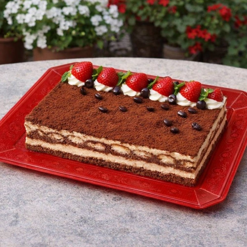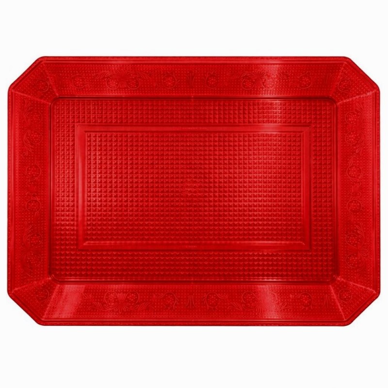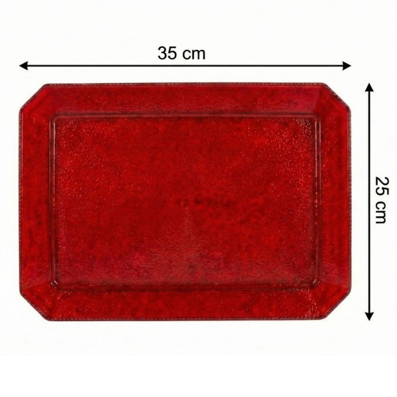 Es ideal para presentar tartas, dulces, alimentos salados, carnes y pescados en eventos, celebraciones o reuniones especiales. Su formato de 35 x 25 cm se adapta tanto al uso profesional en restaurantes y caterings como al entorno doméstico. El color rojo translúcido añade un toque de glamour y distinción, ayudando a crear mesas cuidadas y presentaciones más apetecibles.