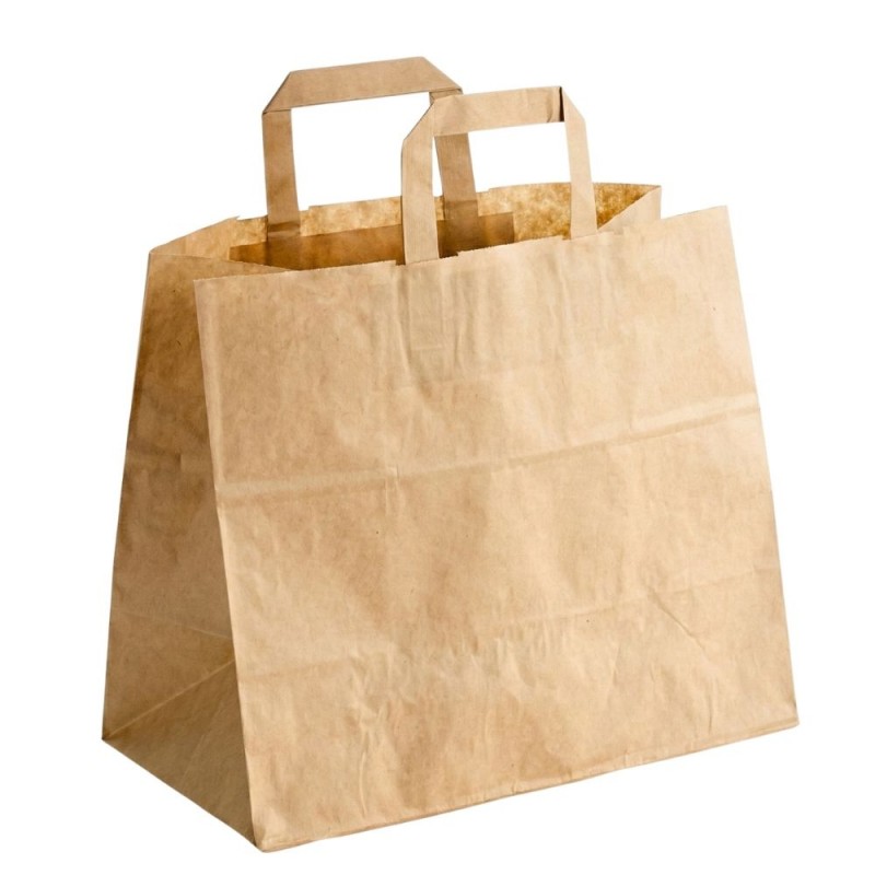Bolsas de papel kraft con asas formato take away grandes de 32+22x26 cm, fabricadas en papel kraft de 80 g.