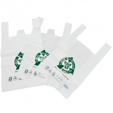 Bolsas de plástico tipo camiseta de 50 x 60 cm, fabricadas con 70 % de material reciclado, en color blanco con impresión verde, reutilizables y reciclables, con 50 micras de espesor para comercios.