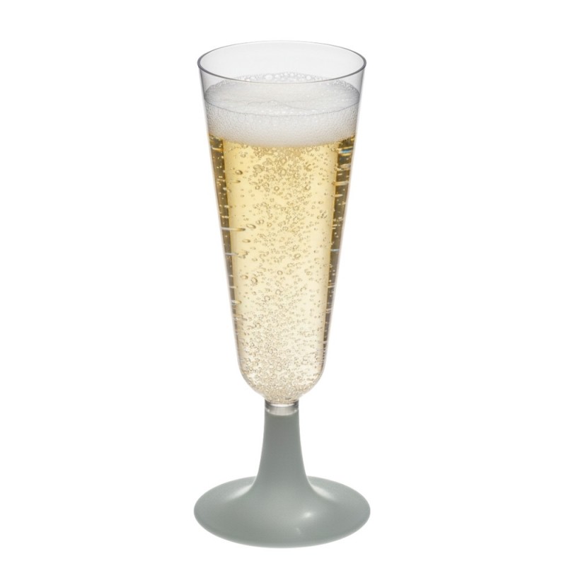 Copas de cava de plástico de 150 ml fabricadas en poliestireno alimentario con efecto cristal y pie plata desmontable, ideales para servir bebidas espumosas en celebraciones con una presentación práctica y elegante.