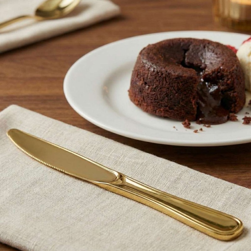 Cuchillos de plástico metalizados dorados de 20 cm, fabricados en poliestireno alimentario, resistentes y reciclables, ideales para platos principales y todo tipo de comidas en eventos elegantes.