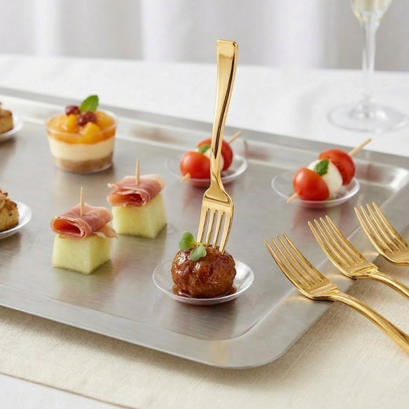 Mini tenedores de plástico metalizados color oro de 10 cm son un accesorio práctico y elegante diseñado para presentar pequeñas degustaciones con un toque sofisticado. Fabricados en poliestireno alimentario, ofrecen una solución higiénica y funcional para servir aperitivos, postres o muestras gastronómicas en eventos y celebraciones. Su tamaño compacto de 10 cm (100 mm) permite una manipulación cómoda y precisa, ideal para porciones pequeñas donde la presentación es clave. El acabado metalizado dorado aporta una apariencia moderna y decorativa que mejora la estética de cualquier mesa, bandeja de servicio o presentación gastronómica.