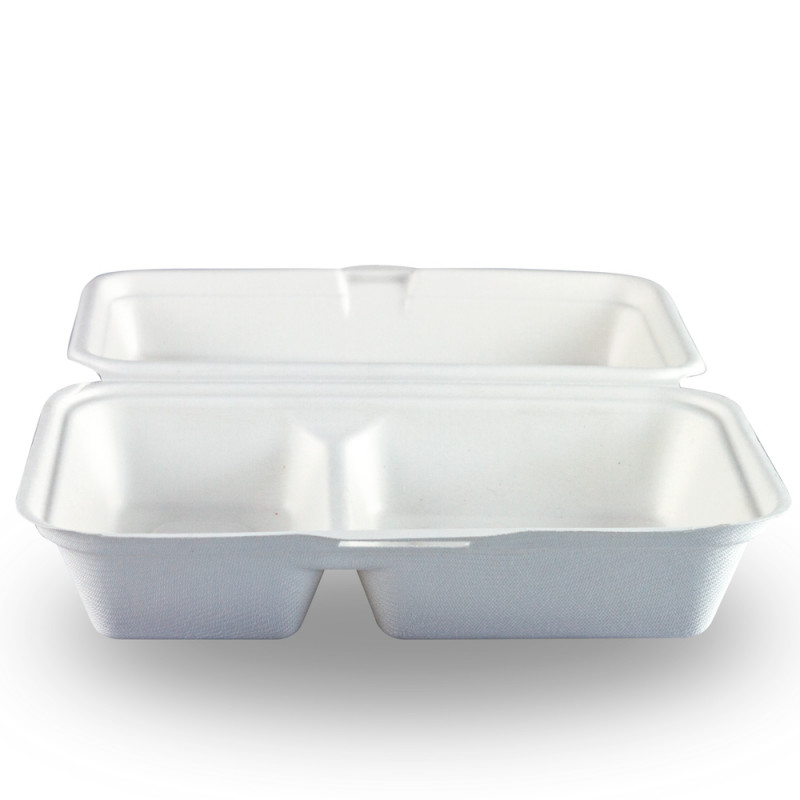 Envases Biodegradables para comida con dos compartimentos de 26 x 16 x 8 cm. Fabricados en caña de azúcar, son 100% biodegradables y compostables. La mejor elección para disfrutar de tus envases desechables ecológicos, respetando el medio ambiente y la naturaleza.