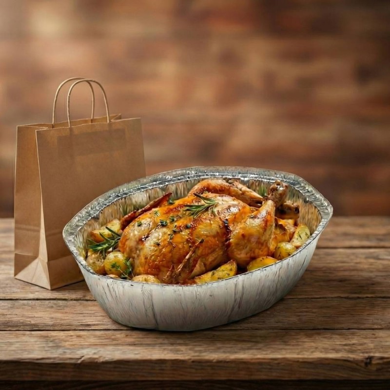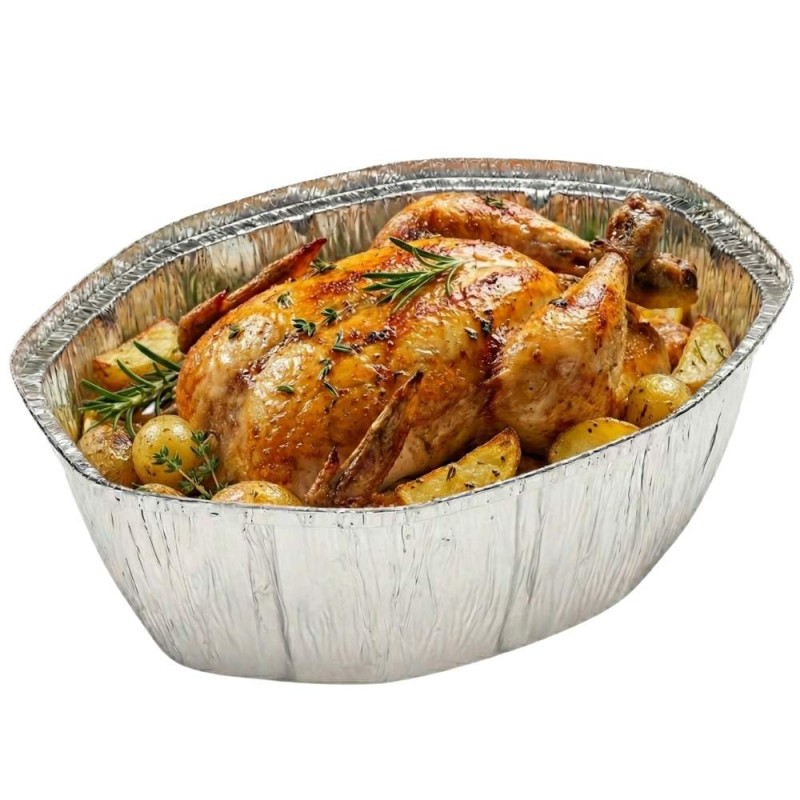 Con una capacidad de 2.600 ml, estos envases se ajustan a las necesidades de negocios que requieren presentar raciones amplias, como pollos asados con guarnición, kebabs u otros platos de gran tamaño. Su formato ovalado optimiza el espacio y mejora la presentación, mientras que su carácter desechable y 100% reciclable responde a criterios de sostenibilidad, ofreciendo una alternativa responsable sin renunciar a la funcionalidad. La posibilidad de incorporar tapas compatibles facilita un transporte seguro e higiénico, especialmente útil en servicios de comida para llevar.