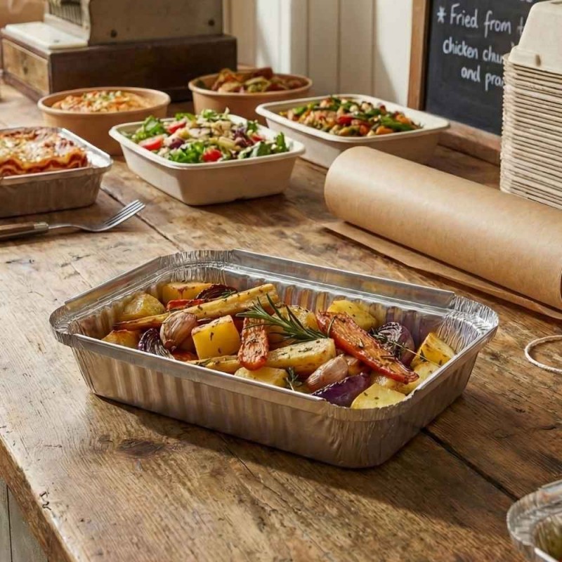 Estos envases rectangulares de aluminio ofrecen una solución segura y profesional para almacenar, transportar y servir alimentos en distintos entornos gastronómicos. Fabricados en aluminio de alta calidad, permiten contener preparaciones frías o calientes y resultan aptos para horno, lo que facilita cocinar, calentar o conservar directamente en el envase sin necesidad de recipientes adicionales. Su capacidad de 590 ml aporta versatilidad para múltiples elaboraciones individuales.