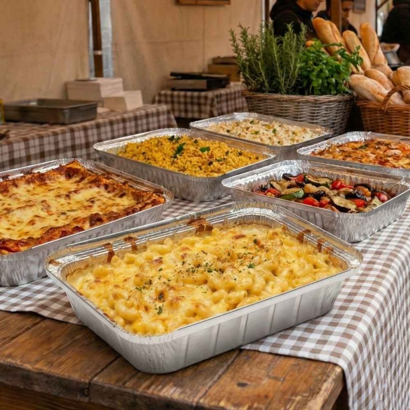 Estos envases rectangulares de aluminio ofrecen una solución segura y profesional para almacenar, transportar y servir alimentos en múltiples entornos gastronómicos. Fabricados con un material de alta calidad, permiten contener preparaciones frías o calientes y son aptos para horno, facilitando cocinar, recalentar o conservar los alimentos directamente en el envase sin necesidad de recipientes adicionales. Su capacidad de 890 ml los convierte en una opción adecuada para raciones amplias que requieren un soporte resistente y fiable.