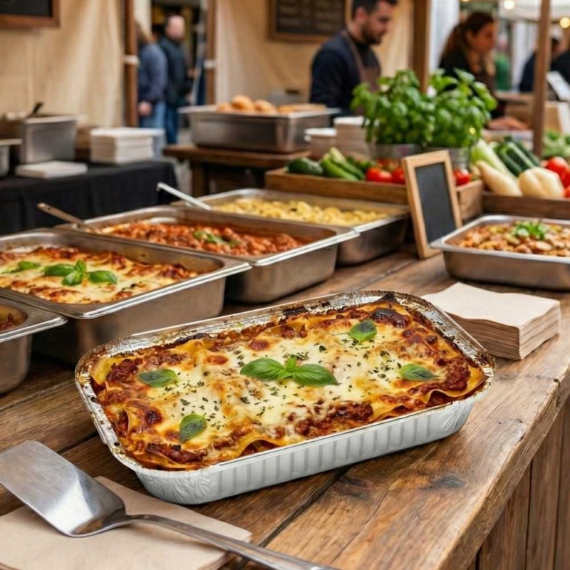 Estos envases de aluminio destacan por soportar temperaturas entre -40ºC y +370ºC, lo que garantiza un excelente rendimiento en hornos, congeladores y otras zonas de preparación. Su resistencia térmica facilita la manipulación en distintas etapas del servicio, manteniendo la integridad de los alimentos durante el almacenamiento o el transporte. Su estructura ligera mejora el manejo y ofrece una solución práctica para establecimientos que requieren envases fiables y adecuados para un uso profesional intensivo.