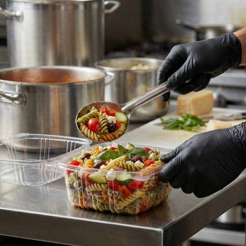 Esta caja de 360 unidades es perfecta para negocios con un volumen elevado de pedidos: restaurantes, caterings, obradores, cocinas centrales, supermercados y locales de comida preparada. Resulta especialmente útil para ensaladas, raciones frías, frutas cortadas, platos listos para exponer o cualquier preparación que necesite una tarrina transparente amplia y estable. Si buscas un envase PET con tapa alta que combine capacidad, resistencia y buena presentación, esta tarrina de 1.000 cc es una opción muy completa para el trabajo diario.
