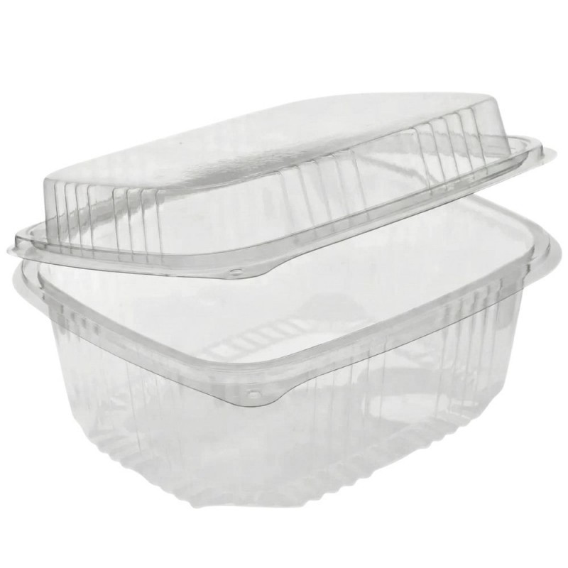 Tarrina de plástico PET con tapa alta plana bisagra de 2.000cc + 700cc en la tapa. Práctica y funcional, esta tarrina está fabricada en plástico PET de alta calidad, perfecta para el uso alimentario y con excelente transparencia.