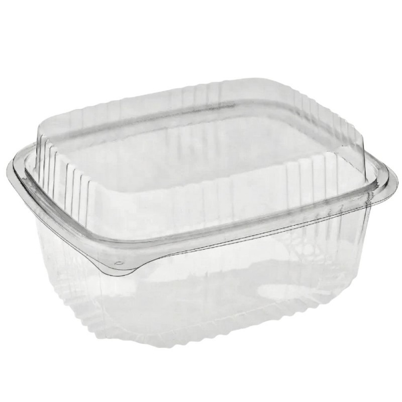 Tarrina de plástico PET con tapa alta plana bisagra de 2.000cc + 700cc en la tapa. Práctica y funcional, esta tarrina está fabricada en plástico PET de alta calidad, perfecta para el uso alimentario y con excelente transparencia.