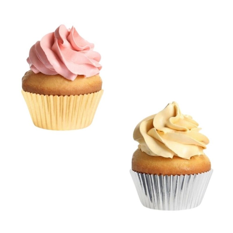 Moldes medianos de papel metalizado para magdalenas de 44 x 28 mm, fabricados en papel de alta calidad en color oro y plata, ideales para cupcakes, muffins y magdalenas con cocción uniforme y fácil extracción.