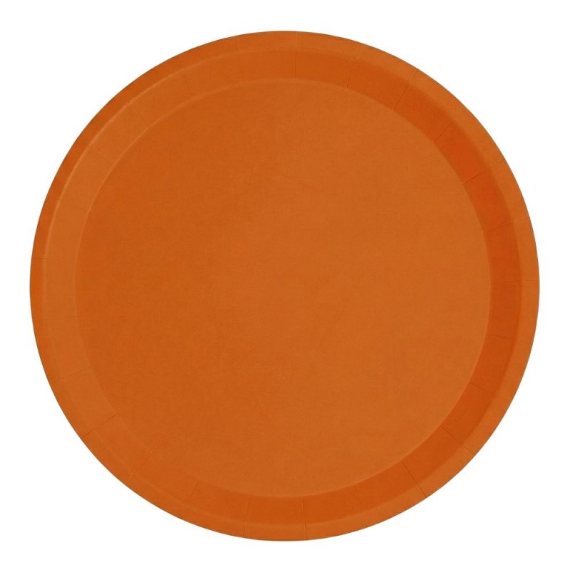 Platos de cartón naranja redondos de 20,5 cm, biodegradables y reciclables, perfectos para servir snacks y aperitivos en celebraciones que buscan estilo y sostenibilidad.