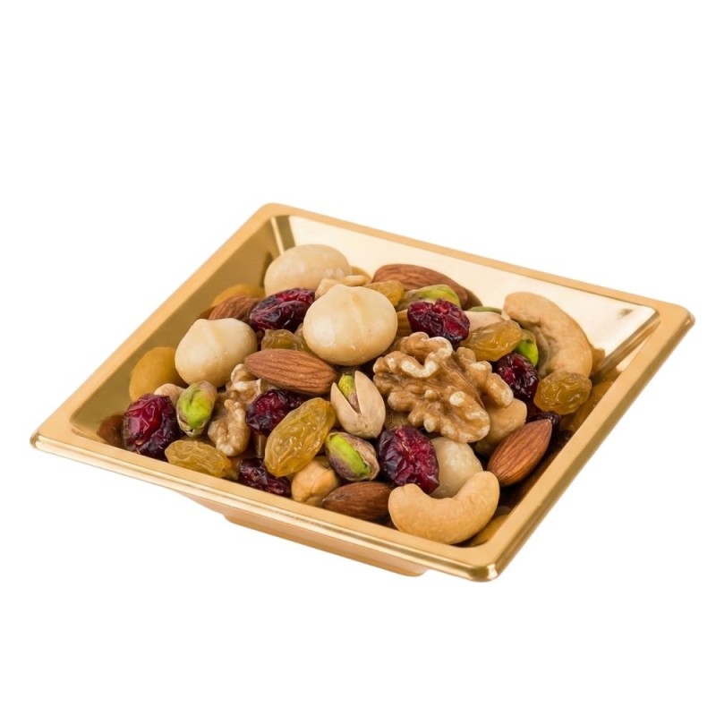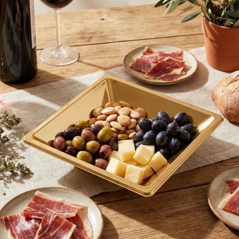 Los cuencos cuadrados de plástico dorado son una solución elegante y práctica para presentar alimentos con estilo en todo tipo de celebraciones. Están fabricados en poliestireno alimentario (PS), un material ligero y resistente que garantiza un uso seguro para el servicio de comida. Su acabado dorado aporta un aspecto sofisticado que realza la presentación de aperitivos, ensaladas o postres, convirtiéndolos en un complemento ideal para eventos donde la estética es tan importante como la funcionalidad.