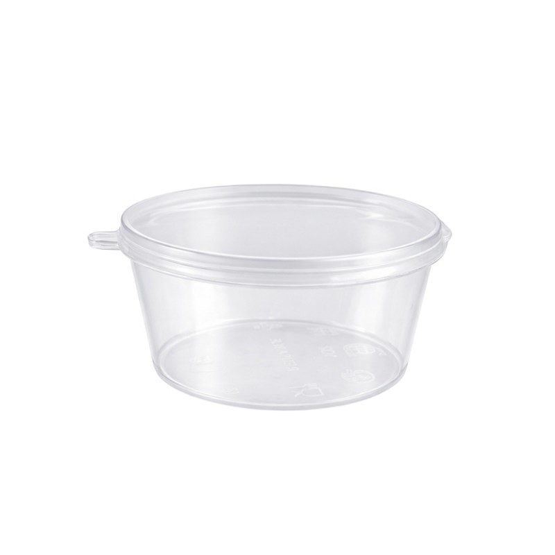 Salseras de plástico con tapa bisagra de 30cc (1oz) en polipropileno (PP) transparente es ideal para salsas y aderezos, reutilizable y apta para microondas, perfecta para hostelería, catering y delivery.