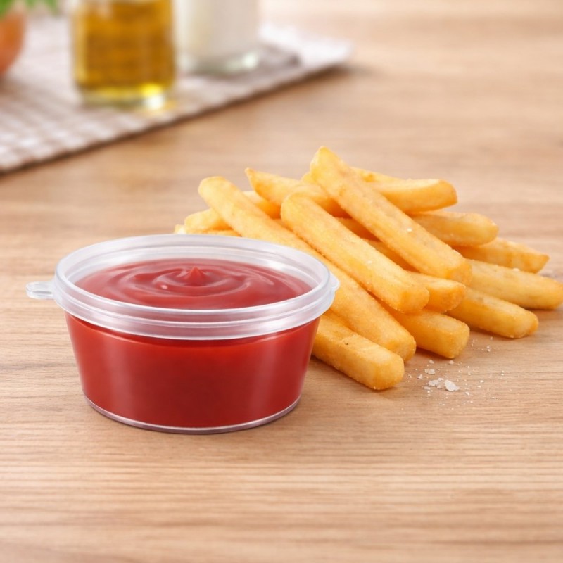 Incorpora una práctica tapa con bisagra integrada que permite una apertura cómoda y un cierre seguro, ayudando a prevenir derrames durante el transporte. Su capacidad de 30cc (1oz) la hace perfecta para ofrecer acompañamientos en porciones controladas sin desperdicio. Es ideal para hostelería, catering, delivery y eventos, combinando higiene, funcionalidad y una presentación cuidada en cada servicio.