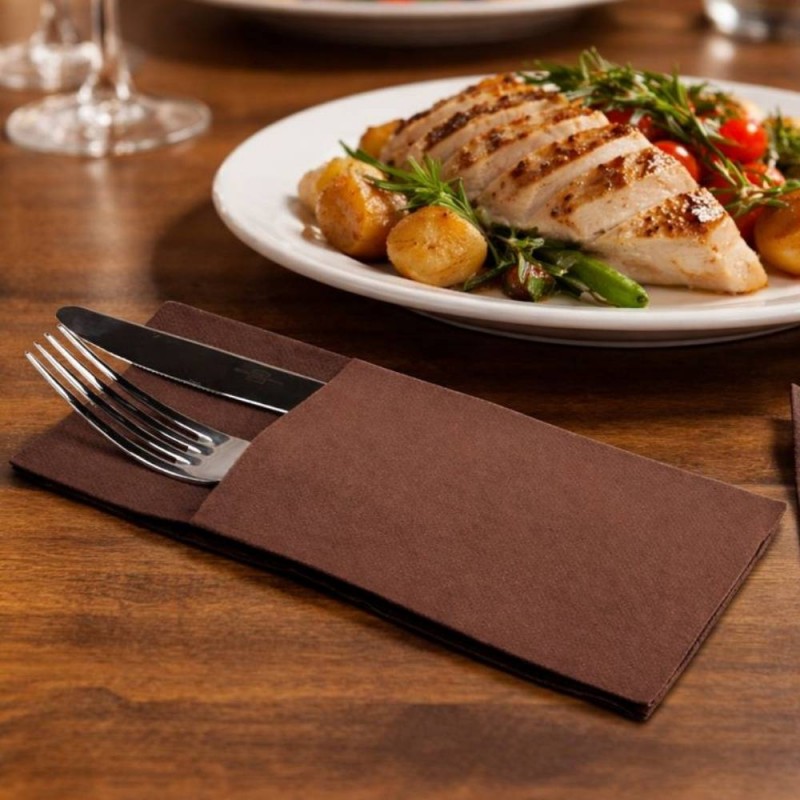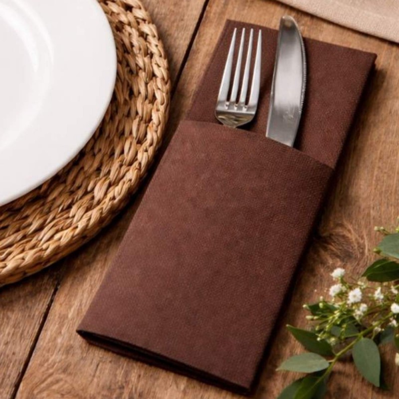 Servilletas Canguro Papel acabado Punta Punta 40 x 40 cm de 2 capas en color Chocolate, también llamadas servilletas porta cubiertos. Perfectas para Catering, Bares, Fiestas, Restaurantes, etc.
