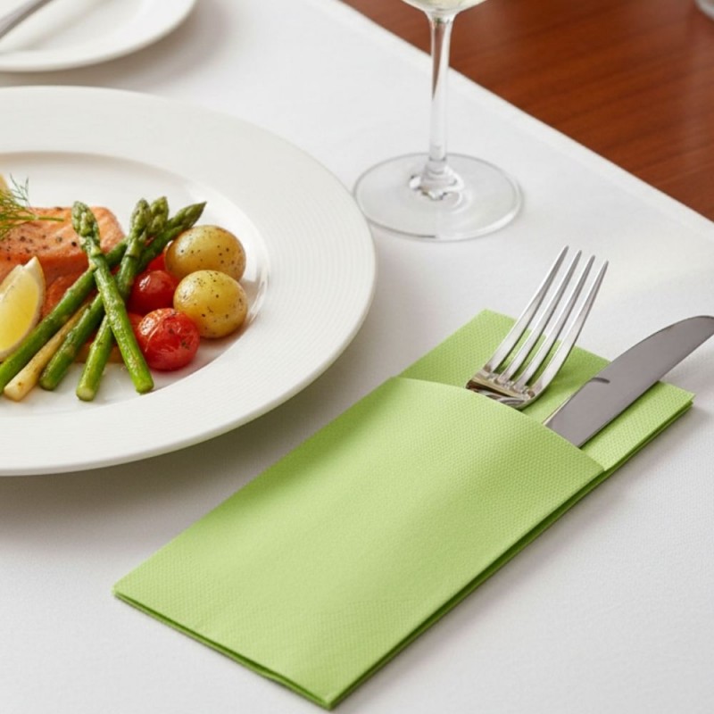 Servilletas Canguro Papel acabado Punta Punta 40 x 40 cm de 2 capas en color Verde Pistacho también llamadas servilletas porta cubiertos. Perfectas para Catering, Bares, Fiestas, Restaurantes, etc.