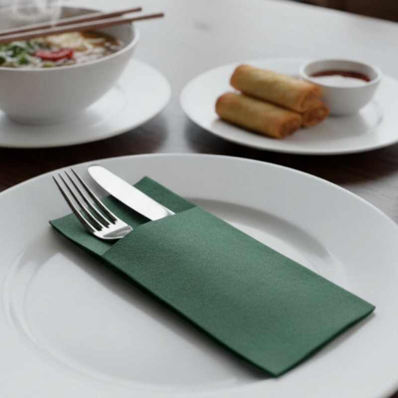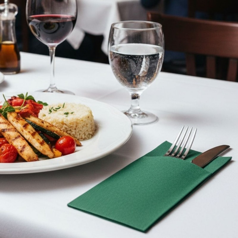 Las servilletas canguro de papel punta punta en color verde son una opción práctica y con estilo para hostelería, catering y todo tipo de eventos. También conocidas como servilletas porta cubiertos, combinan comodidad y presentación al permitir introducir el set de cubiertos de forma sencilla. Se presentan en paquetes de 30 unidades, una cantidad manejable para negocios que buscan flexibilidad en sus compras sin renunciar a la calidad.