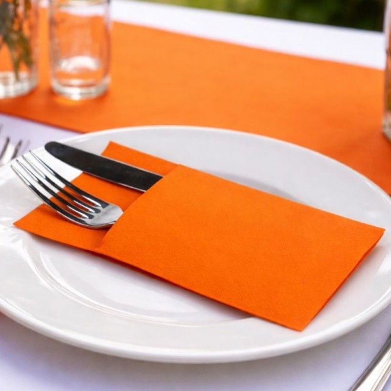 Servilletas Canguro Papel acabado Punta Punta 40 x 40 cm de 2 capas en color Naranja, también llamadas servilletas porta cubiertos. Perfectas para Catering, Bares, Fiestas, Restaurantes, etc.