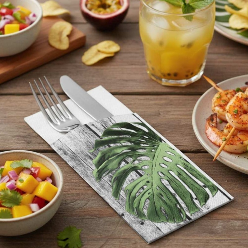 Estas servilletas porta cubiertos con diseño Tropical en cajas de 960 unidades son la mejor opción para negocios que requieren volumen sin renunciar a la calidad y la estética. En Usopack puedes adquirirlas con descuentos por cantidad y precios competitivos, asegurando siempre una compra rentable con entrega rápida. Una alternativa práctica y con estilo para restaurantes, bares, catering y celebraciones que buscan cuidar la presentación en cada detalle.