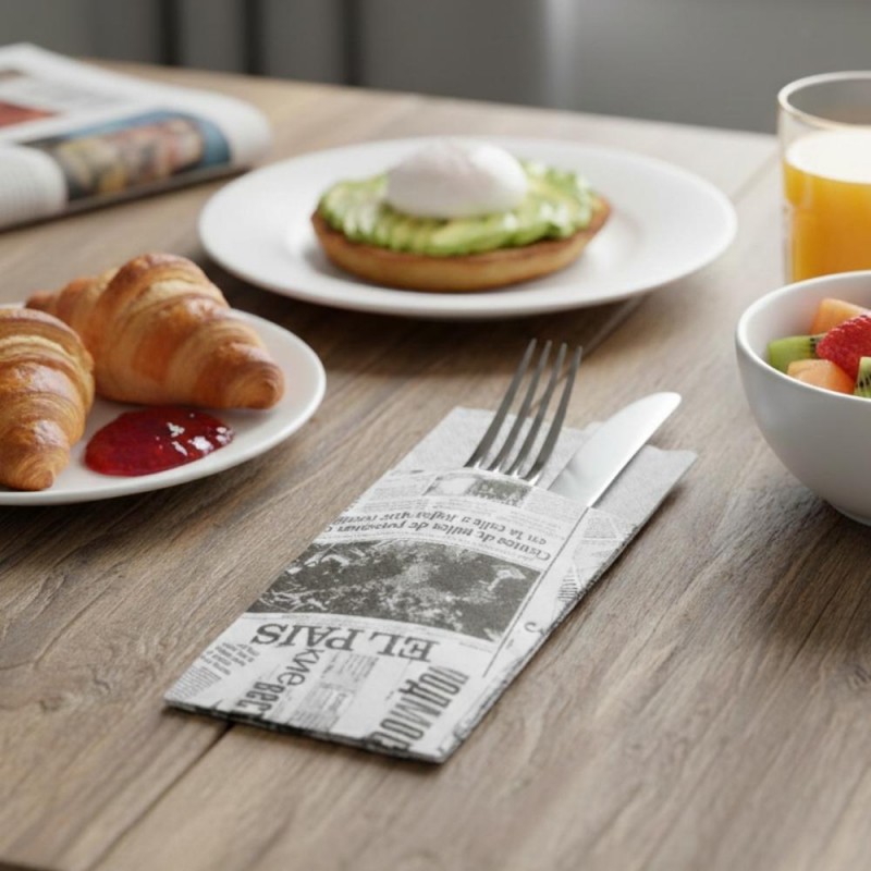 Fabricadas en papel de dos capas con acabado punta-punta, estas servilletas ofrecen resistencia, suavidad y un acabado de calidad que mejora la experiencia del comensal. El diseño News, con su estilo original y llamativo tipo periódico, añade personalidad a la mesa y refuerza la imagen del establecimiento. Su tamaño de 40x40 cm, plegado tipo canguro, permite mantener los cubiertos ordenados y protegidos, optimizando la preparación y transmitiendo una presentación profesional en cada servicio.