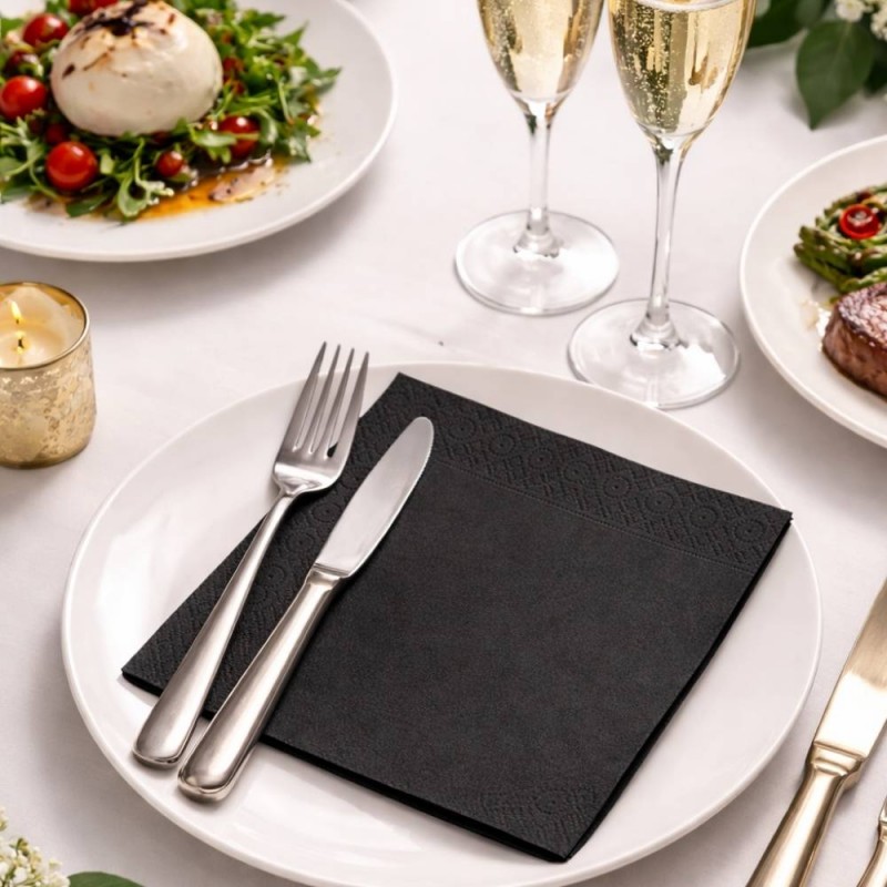 Cada caja incluye 48 paquetes de 50 servilletas de papel negras, lo que asegura un suministro abundante y continuo para locales con alta rotación de clientes. Su tamaño de 33 x 33 cm abiertas (16,5 x 16,5 cm plegadas) y su color negro intenso permiten integrarlas fácilmente en presentaciones formales, celebraciones temáticas o servicios de catering modernos y cuidados.