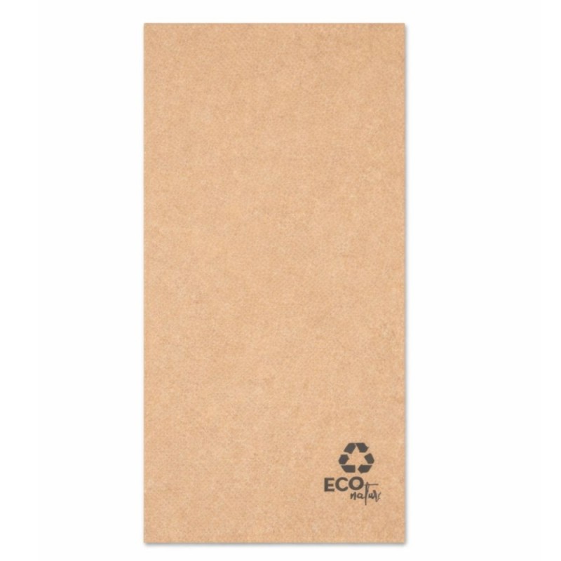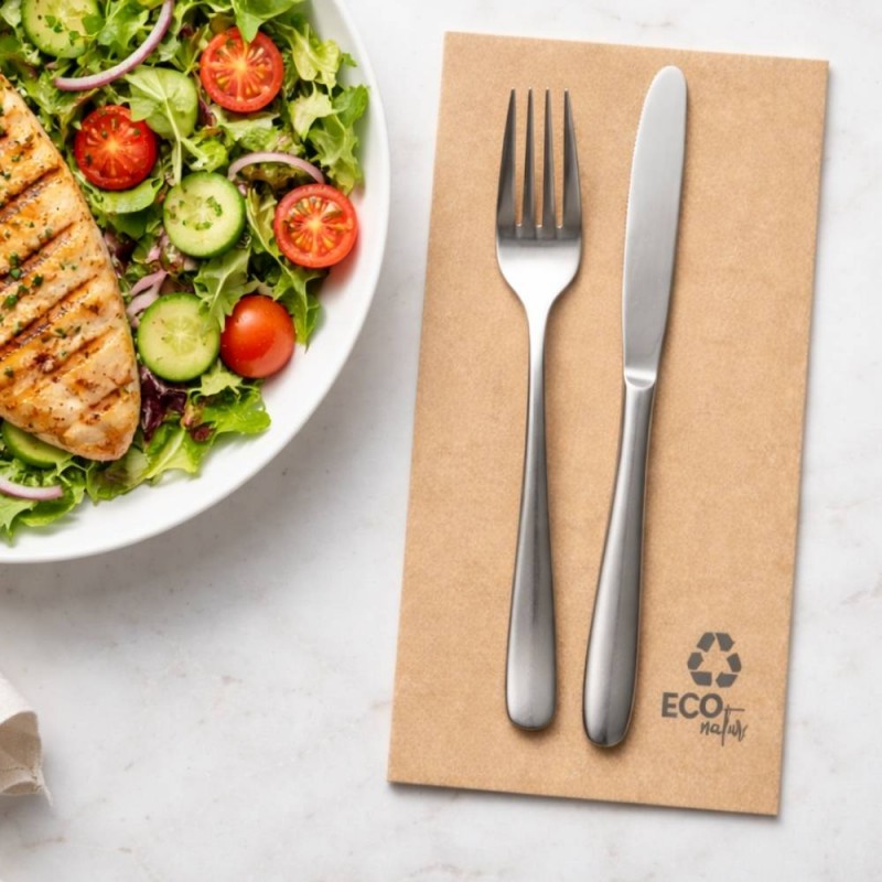 Fabricadas en papel reciclado con acabado punta punta de 2 capas, estas servilletas destacan por su suavidad, resistencia y capacidad de absorción. El plegado 1/8 (10 x 20 cm una vez dobladas) facilita su colocación en mesas y bandejas, aportando comodidad y orden. Su tono marrón kraft refuerza la estética natural y ecológica, aportando un valor añadido a restaurantes, bares y cafeterías que apuestan por productos respetuosos con el medio ambiente.