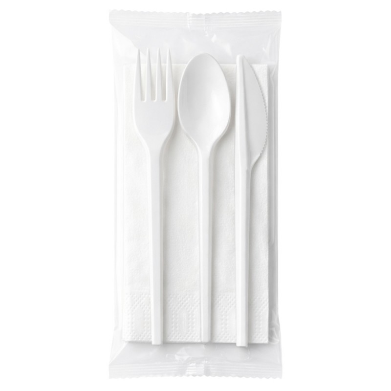 Sets cubiertos de plástico desechables blancos, compuestos por tenedor, cuchara, cuchillo y servilleta.