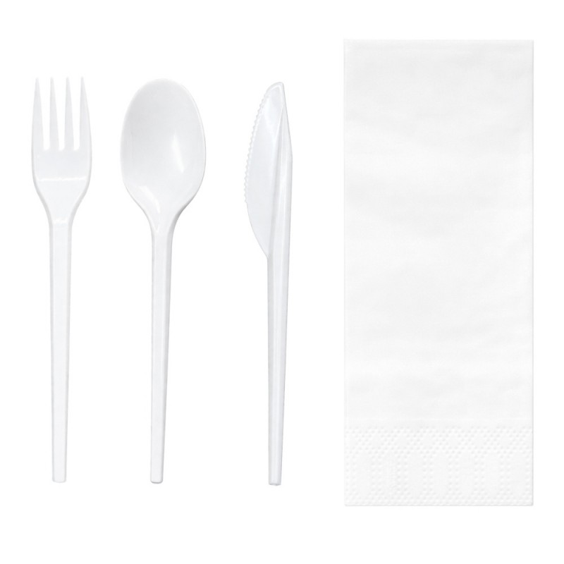 Sets cubiertos de plástico desechables blancos, compuestos por tenedor, cuchara, cuchillo y servilleta.