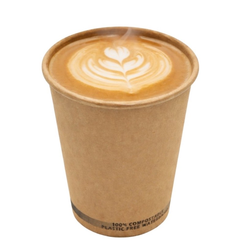 Ver más grande Vasos de cartón Kraft Biodegradables con capacidad de 180ml, fabricados en papel kraft, también llamados vasos de papel ecológico o vasos de cartón ecológicos, este material es 100% Compostable, la mejor opción y ecológica para disfrutar de tus vasos para café desechables ecológicos y respetar el medio ambiente y la naturaleza. Vasos compatibles con la tapa drink de Ø7,2cm.