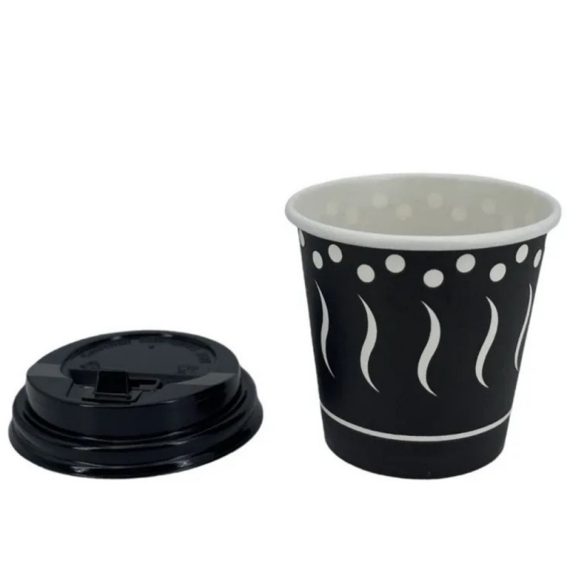 Vasos de Cartón Negros "Coffee" con capacidad para 120 cc con Tapas Drink. Estos Vasos Desechables de Cartón son ideales para bebidas calientes, como café, té, infusiones, etc. Pero su uso también es perfecto para bebidas frías. Las tapas están incluidas en el precio.