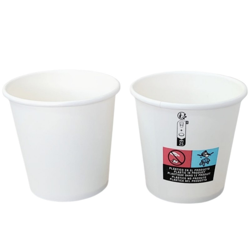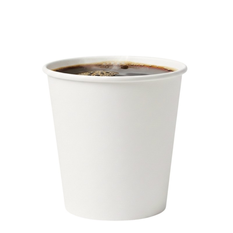 Ver más grande Vasos de cartón de 120ml, fabricados en papel blanco. También llamados vasos de papel café o vasos de cartón desechables, este material es 100% Reciclable, la mejor opción y ecológica para disfrutar de tus vasos para café desechables y respetar el medio ambiente y la naturaleza. Opcionalmente esta disponible la tapa tapa drink de Ø6,2cm. para este vaso.
