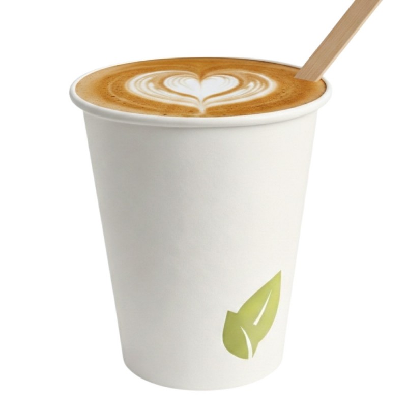 Ver más grande Vaso de papel color blanco con hojas para café con capacidad de 200ml desechables, perfecto para cafés, bebidas calientes y bebidas frías. Su material es cartón color natural reciclable, contribuyendo a la sostenibilidad y ecología del medio ambiente.