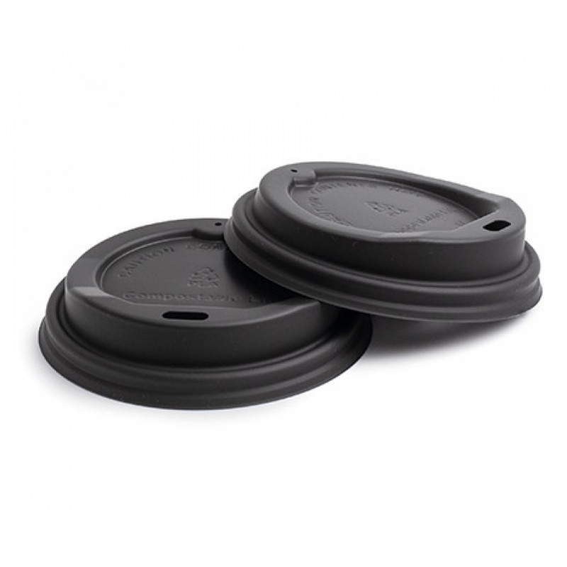 Ver más grande Tapas Biodegradables Travel para los Vasos de cartón con diámetro de Ø8cm. Fabricadas en PLA de color Negro, son tapas 100% Compostables y ecológicas.