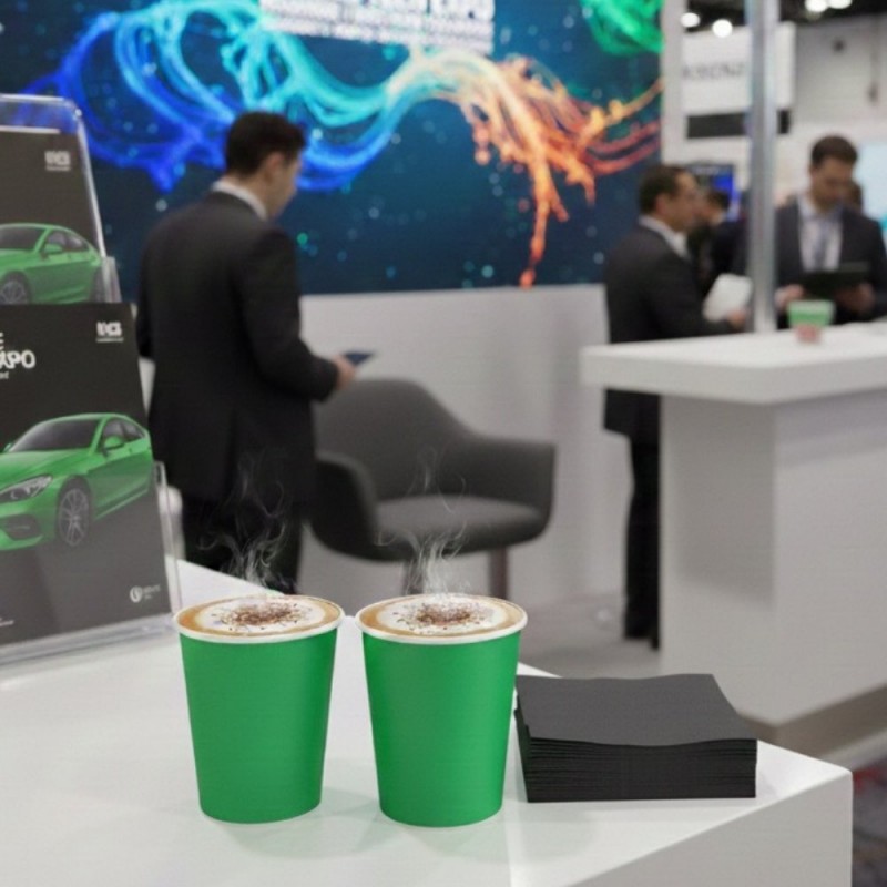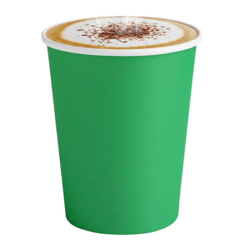 Vasos de cartón color verde de 260ml, fabricados en papel + PE. También llamados vasos de papel para fiestas o vasos de cartón café, este material es 100% Reciclable, la mejor opción para disfrutar de tus vasos desechables y respetar el medio ambiente y la naturaleza.