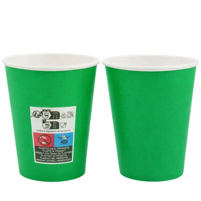Vasos de cartón color verde de 260ml, fabricados en papel + PE. También llamados vasos de papel para café o vasos de cartón para fiestas, este material es 100% Reciclables, la mejor opción para disfrutar de tus vasos para café desechables y respetar el medio ambiente y la naturaleza.