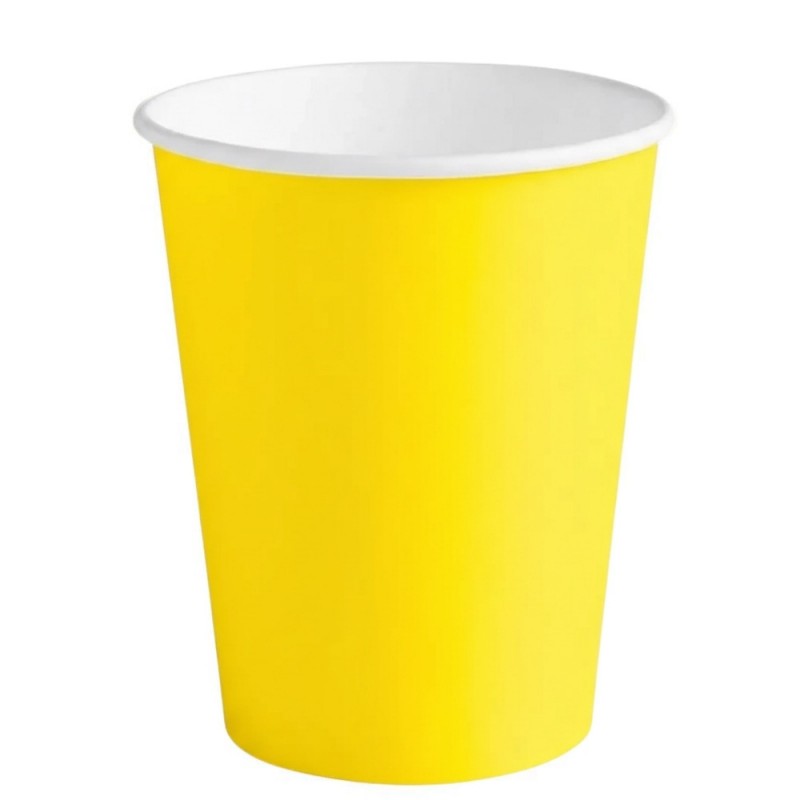 Vasos de cartón color amarillo de 260ml, fabricados en papel + PE. También llamados vasos de papel para fiestas o vasos de cartón café, este material es 100% Reciclable, la mejor opción para disfrutar de tus vasos desechables y respetar el medio ambiente y la naturaleza.