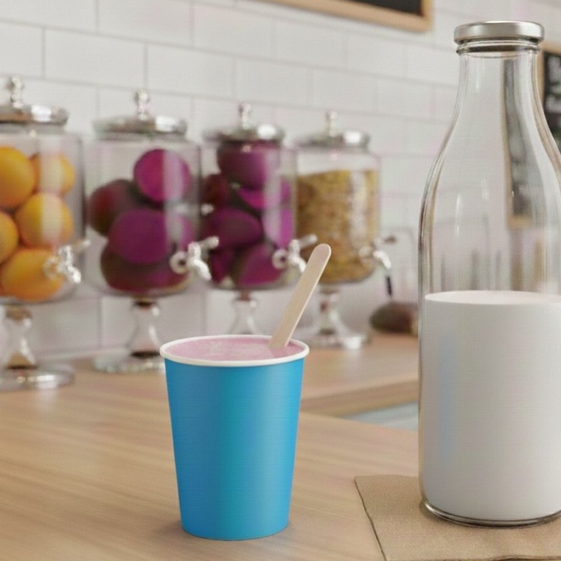 Vasos de cartón color azul de 260ml, fabricados en papel + PE. También llamados vasos de papel para café o vasos de cartón para fiestas, este material es 100% Reciclables, la mejor opción para disfrutar de tus vasos para café desechables y respetar el medio ambiente y la naturaleza.
