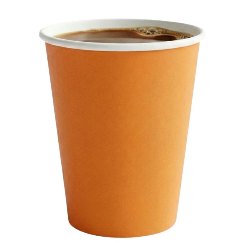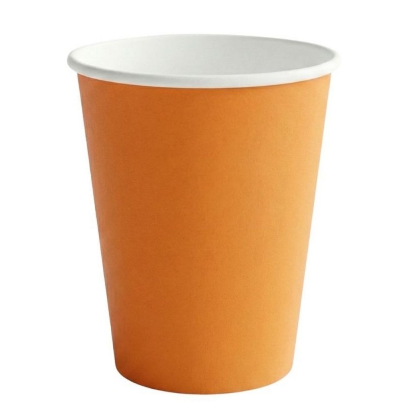 Los vasos de cartón naranjas de 260 ml, fabricados en cartón con recubrimiento de PE, son ideales para servir bebidas frías o calientes en fiestas, eventos y hostelería, ofreciendo resistencia, color y un uso desechable muy práctico.