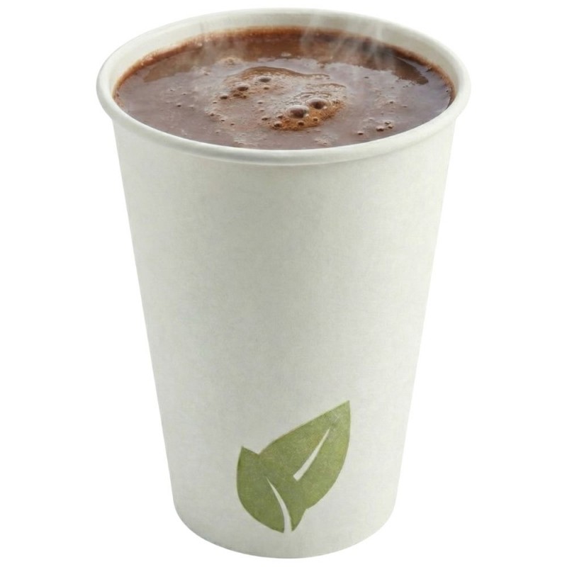 Ver más grande Los vasos de cartón blanco Natura Hojas de 480 ml, fabricados en cartón con recubrimiento de PE, son perfectos para bebidas frías o calientes y ofrecen un diseño natural y práctico ideal para hostelería, eventos y servicios para llevar.