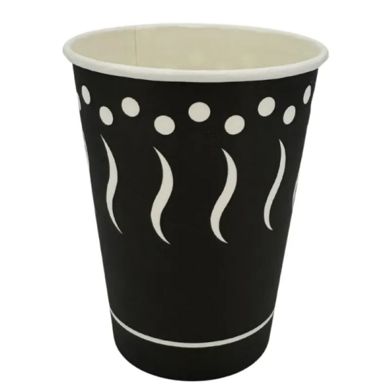 Vasos de cartón de 360 ml con diseño negro, fabricados en cartón con PE, desechables y resistentes, aptos para bebidas calientes y frías, ideales como vasos de café para llevar.