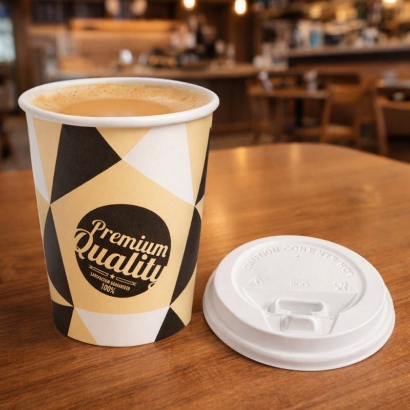 El sistema de tapa drink permite al cliente disfrutar de su bebida cómodamente y sin riesgo de derrames, lo que los hace especialmente indicados para servicios de take away, oficinas y eventos. Su diseño neutro en tonos blanco y marrón proyecta una imagen cuidada, limpia y profesional. Además, su formato cerrado con tapa mejora la conservación del contenido y facilita el consumo en movimiento, ofreciendo una experiencia más completa y satisfactoria.