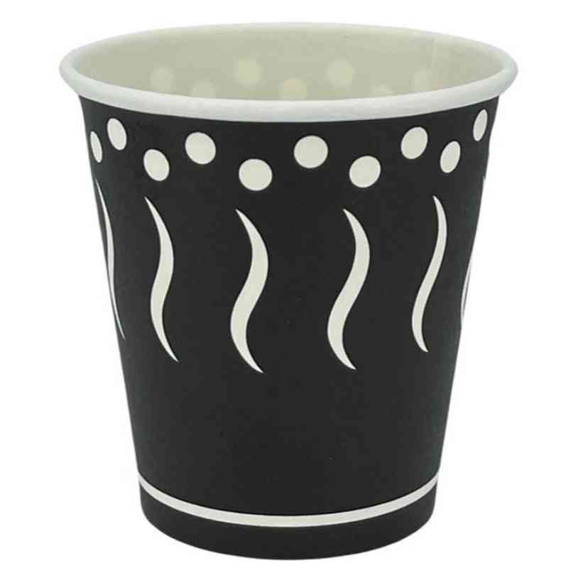 Ver más grande Vasos de Cartón Negro y Diseño Coffee con capacidad para 240 cc. Estos Vasos Desechables de Cartón son ideales para bebidas calientes y frías, como café, té, infusiones, degustaciones, licores, refrescos, etc. Opcionalmente esta disponible la tapa para este vaso. Vasos compatibles con la tapa drink de Ø8cm.