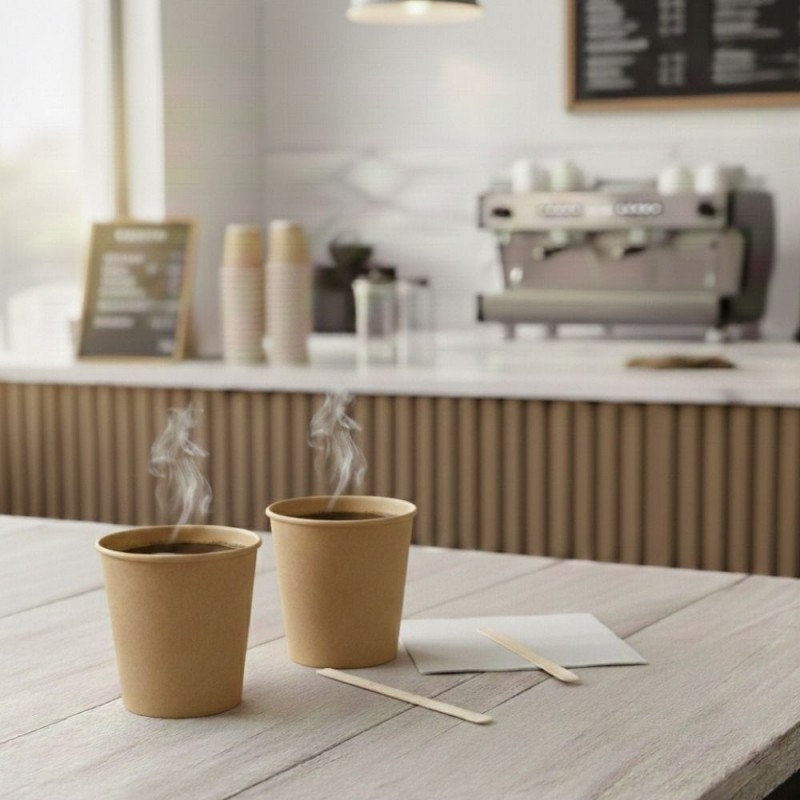 Con un diámetro superior de 6,2 cm y 5,9 cm de altura, estos vasos son cómodos de sujetar y ofrecen una excelente resistencia al calor. Son compatibles con la tapa drink biodegradable Ø6,2 cm, permitiendo un servicio take away más seguro y profesional. El cartón kraft, además de aportar un aspecto cálido y diferenciador, contribuye a reducir el impacto ambiental, reforzando la imagen sostenible de tu negocio.