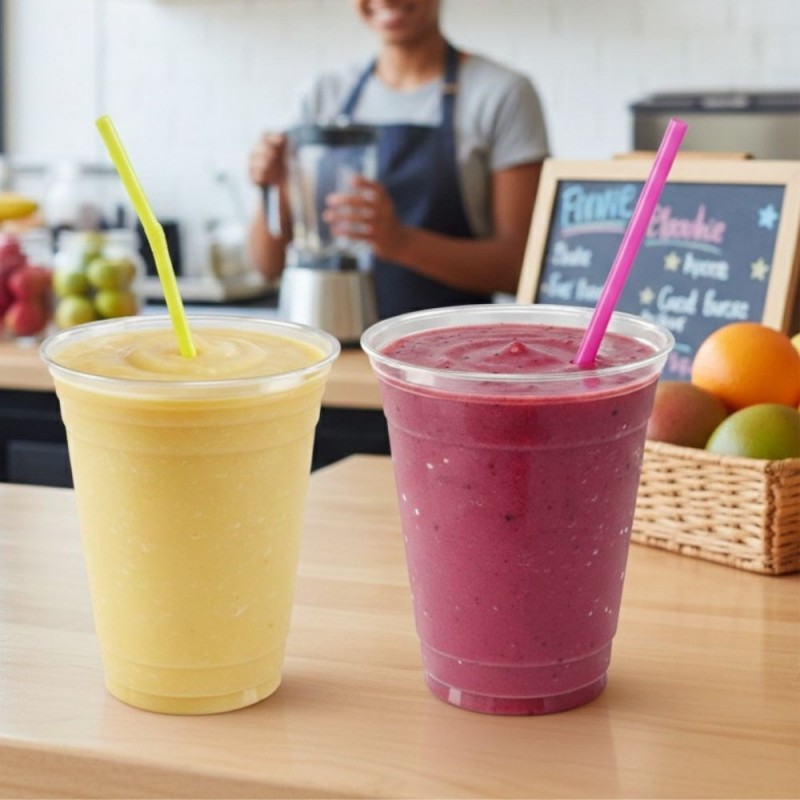 Estos vasos de plástico transparentes de 360 ml destacan por su gran apertura superior de 9,5 cm, lo que los convierte en una excelente opción para servir batidos, smoothies, frappés, zumos y postres fríos con toppings. Están fabricados en PET, un plástico rígido, transparente y seguro para alimentos que resalta la presentación del contenido. Su capacidad de 360 cc y su diseño robusto los hacen especialmente atractivos para negocios que buscan una imagen profesional y limpia.
